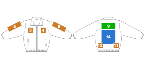 3右胸 4左胸 11背中右すそ 12背中左すそ |